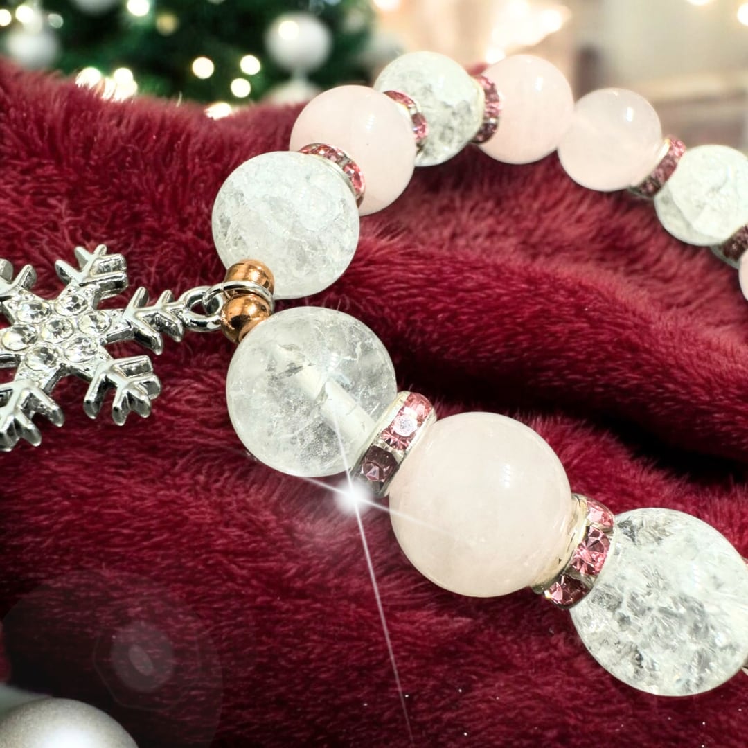 この雪の結晶チャーム付き・ローズクォーツ・クラック水晶のデザインブレスは、冬の神秘的な美しさを感じさせるアイテムです。ローズクォーツは愛と癒しのエネルギーを持ち、クラック水晶はエネルギーの増幅を助け、深いリラックスをもたらします。